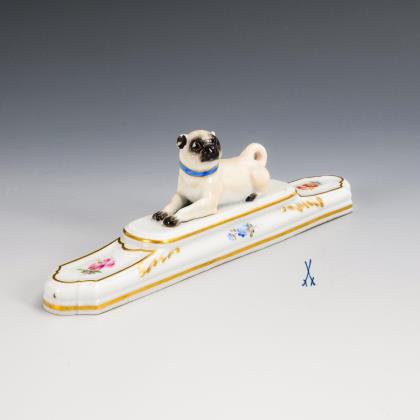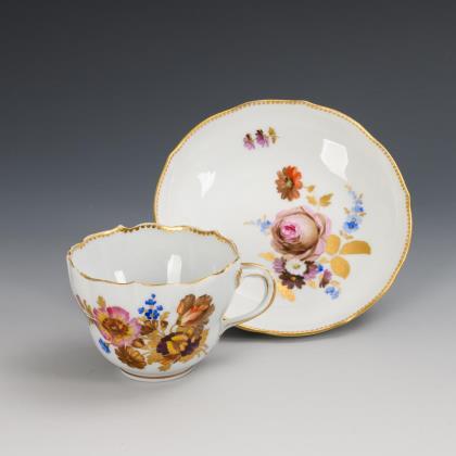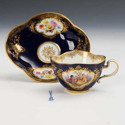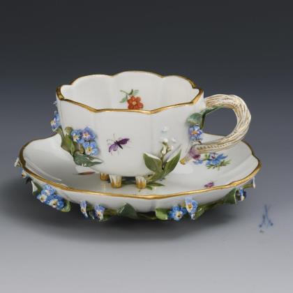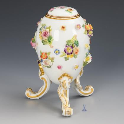 Modell von Ernst August Leuteritz 1863-1865. Ornamental reliefiert, gold staffiert, mattiert und poliert, farbige florale Bemalung. Pressmarken, Malermarke, Schwertermarke