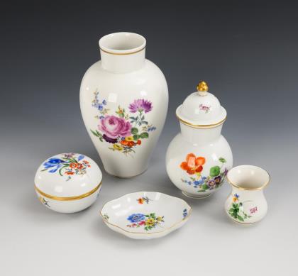 3 vases, box, quatrefoil bowl and plate with flower painting. Meissen.