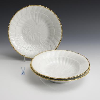 3 mocha covers, 2 tureens and 3 plates with gold flower. Meissen.