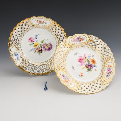 Openwork bowl and cake plate with flower painting. Meissen.