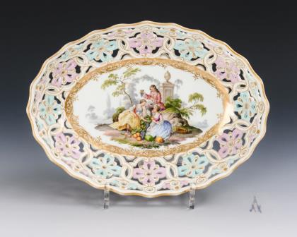 Ovale Schale mit Blütendurchbruch, im Spiegel die Darstellung einer Parklandschaft mit zwei Rokokodamen und einem Gärtner mit Früchten