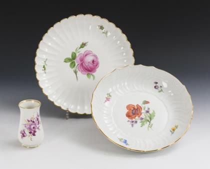 2 bowls and 1 vase with flower painting. Meissen.