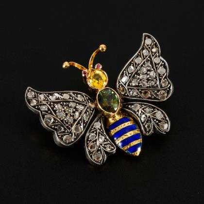 Butterfly" brooch with old-cut diamonds and colored stones.