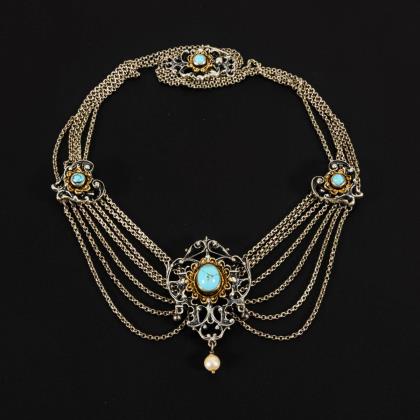 Traditional necklace with turquoise and cultured pearl.