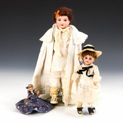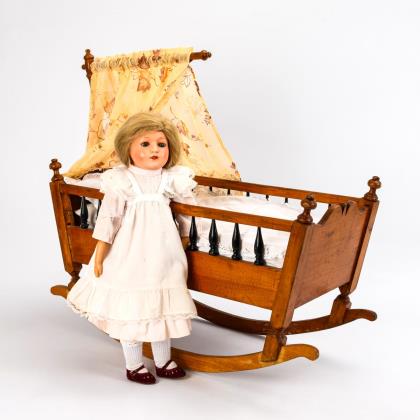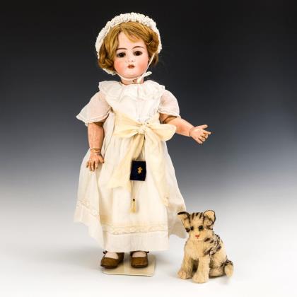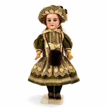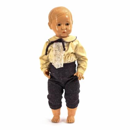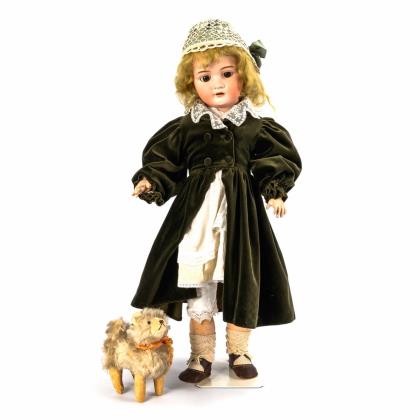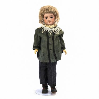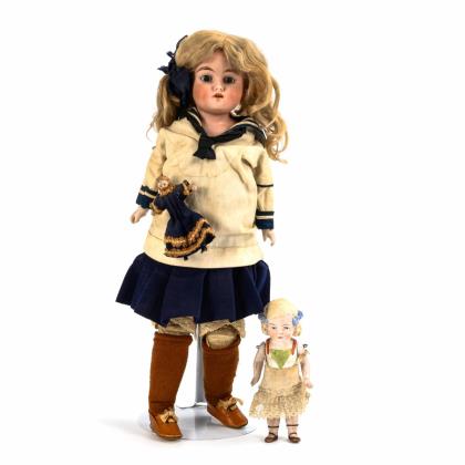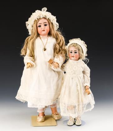 Both with crank head, blue sleeping eyes and dark blond wig. The larger one for Kämmer and Reinhardt: 11-piece body with running mechanism. L 63 cm. The smaller one for Wiesenthal, Schindel & Kallenberg: 15-piece jointed body. L 55 cm. Both with light-colored dresses, hood and white leather shoes.