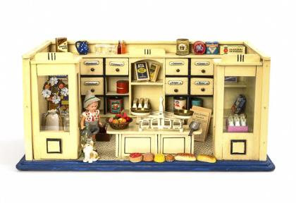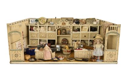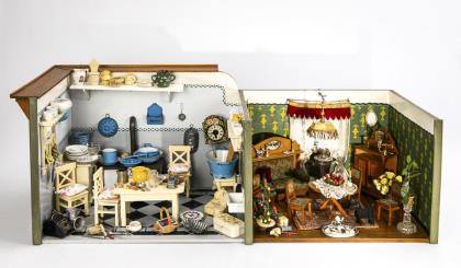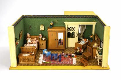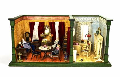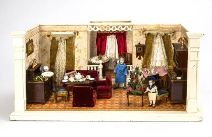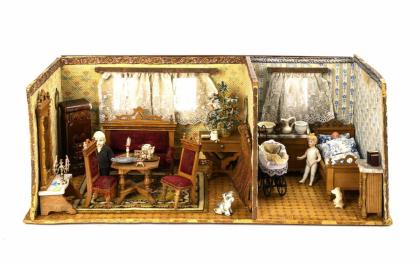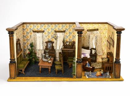 Doll's house with Biedermeier parlor and white Art Nouveau bedroom.