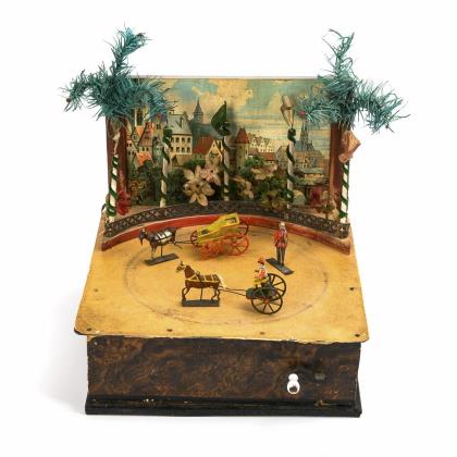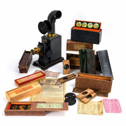 Cinematograph / Laterna Magica with numerous sliding pictures and film reels. Ernst Planck.