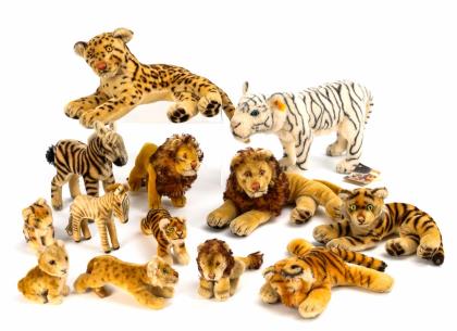 Collection of 11 cats of prey and 2 zebras. Steiff.