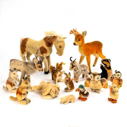 15 cuddly toys, including 2 kangaroos with baby. Steiff.