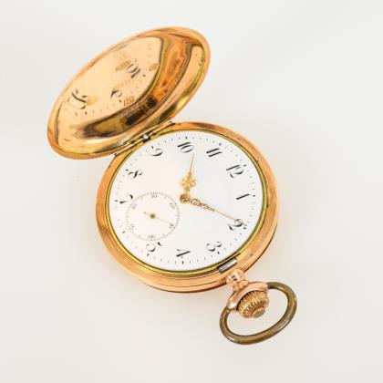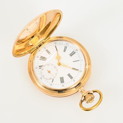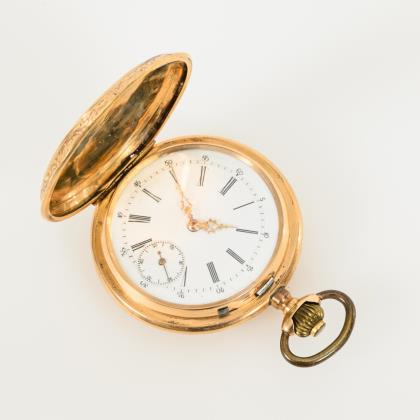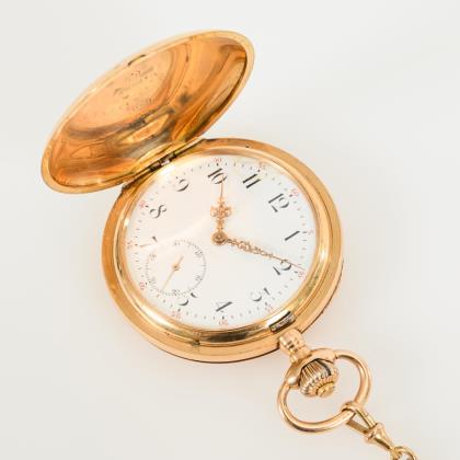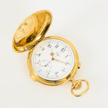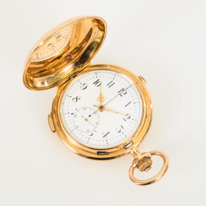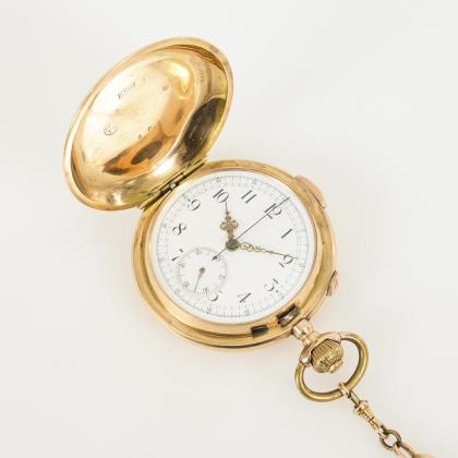 Golden savonnette with minute repeater and chronograph on a golden watch chain.