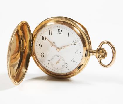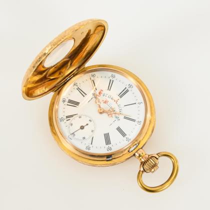 Beidseits aufwendig graviertes Gehäuse mit ornamentalem Dekor und Schweizer Goldstempel ab 1893, Metall-Innendeckel. Vergoldetes Brücken-Ankerwerk, Kronenaufzug. Weißes Emailzifferblatt, schwarze arabische Zahlen, durchbrochen gearbeitete Zeiger, kleine Sekunde