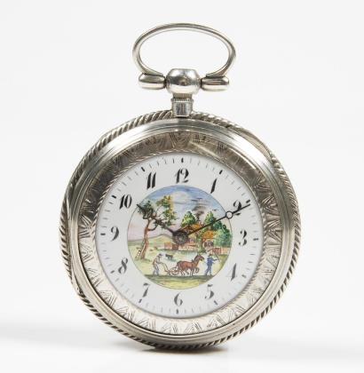 Werk signiert. Graviertes Gehäuse mit Wiener Punze von 1847. Spindelwerk mit Kette und Schnecke, filigran durchbrochen gearbeiteter Kloben, floral gravierte Platine. Weißes Emailzifferblatt, schwarze arabische Zahlen, mittig farbig gemalte bäuerliche Genreszene, Schlüsselaufzug