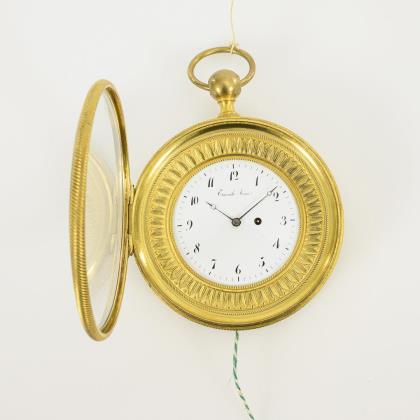 Guillochiertes Gehäuse mit französischer Feingehaltspunze (1819-1838). Metall-Innendeckel, vergoldete Vollplatine mit gebläuten Stahlschrauben und filigran durchbrochen gearbeitetem Kloben. Viertelstundenschlagwerk auf Tonfeder, Auslösen des Schlagwerkes durch Drücken des Pendants. Spindelgang über Kette und Schnecke. Weißes Emailzifferblatt, schwarze arabische Zahlen, Schlüsselaufzug