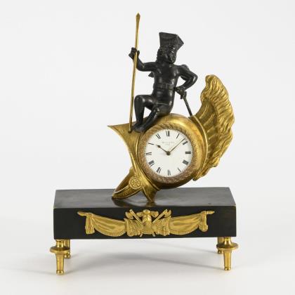 Delicate Empire table clock with putto. Barwise & Sons, London.