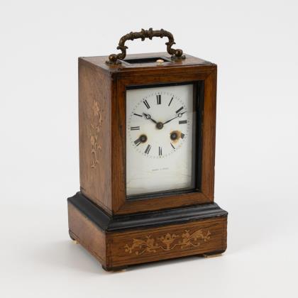 Kutschenuhr in Etui, Frankreich Anf. 19. Jh. Bronze, vergoldet. Rundes Gehäuse m. fein relief. Oberfläche, d. Blatt-gerahmte Emaille-Zifferblatt rahmend. Arab. Ziffern m. Min.anzeige, 1 Aufzug, sign. "Tarault Jeune". Schlag auf Glocke, Repetition. Werkplatte sign. "Jean Fol Paris". Durchbrochener Staubdeckel. In orig. Etui (außen rotes Leder, beiges Futteral). Mit 2 Schlüsseln. Vergoldung berieben, Etui m. starken Gebr.- spuren. Uhr D 10,3 cm Jean Fol, Paris, Tarault Jeune, vergoldet