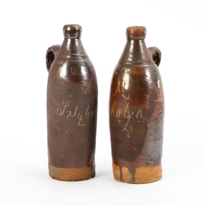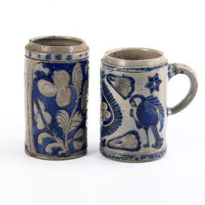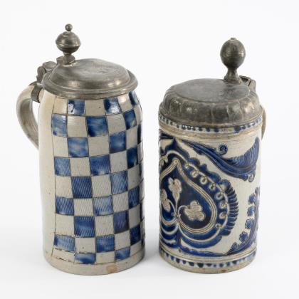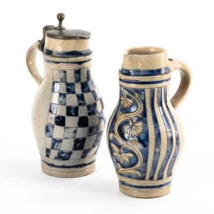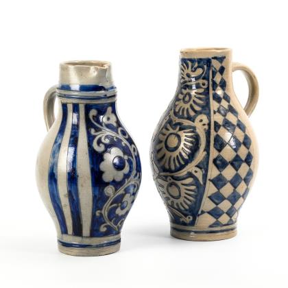 2 Westerwald roller jugs with ornate floral pattern and checkerboard decoration.
