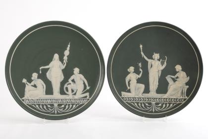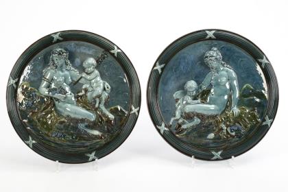 2 large Phanolith wall plates with allegorical depictions of the arts and crafts. Villeroy & Boch.