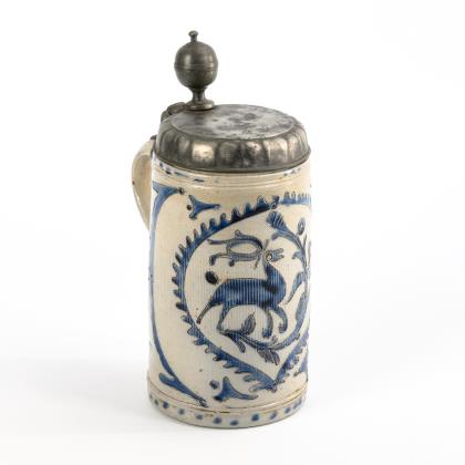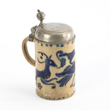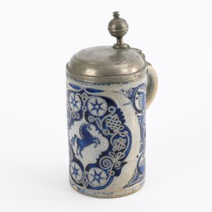 Westerwald roller jug with leaping horse and ornate scrollwork and foliage.
