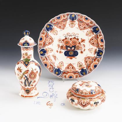3 Delft faiences with painting in the style of Imari ceramics. De Porceleyne Fles.