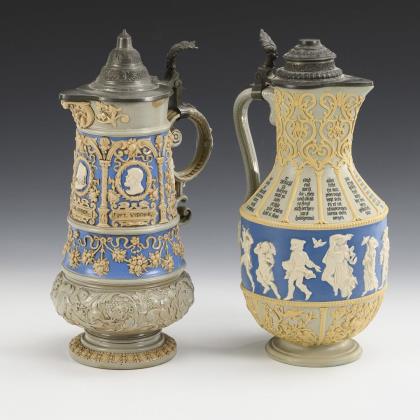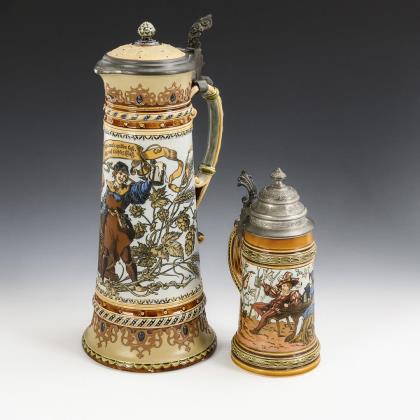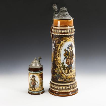 Large and small Wilhelminian style jug with Landsknecht motif. Villeroy & Boch.