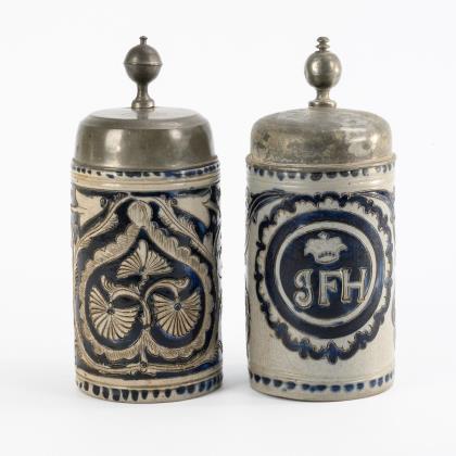 2 Westerwald steins with crowned monogram JFH and ornate floral decoration in spades.