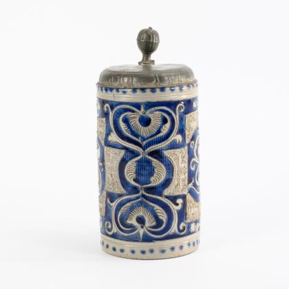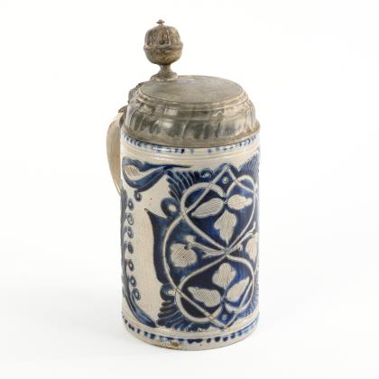 Westerwald roller jug with rosette in leaf-flanked reserve.