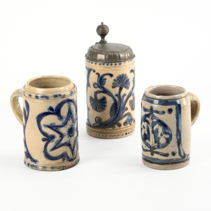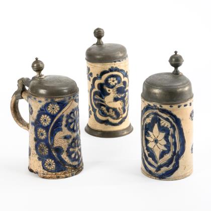 3 Westerwald roller jugs with flowers, bird matrices and grid pattern.