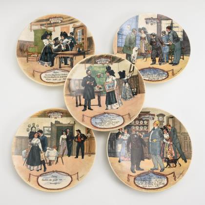 5 wall plates with genre scenes from the series "Der Herr Maire" by G. Stoskopf. Utzschneider & Co, Sarreguemines.