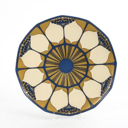 um 1901, Entwurf Josef Maria Olbrich attr., Modell "Pommern", braune Kunstabteilungsmarken V & B Dresden, weitere Prägemarke, die Fahnenränder verziert mit kobaltblauem Banddekor