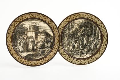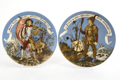 Paar Chromolith-Wandteller, Villeroy & Boch, Mettlach, Historismus (Ende 19. Jh.), Steinzeug, geritzt, polychrom bemalt, rund, leicht gemuldet, Darstellung zweier vor einer Landschaft mit Burg stehender Landsknechte, auf der oberen Hälfte je ein Spruchband 'Gutes Recht findt allzeit Knecht' bzw. 'Trutz ohne Macht wird verlacht', jeweils rückseitig geprägter Manufakturstempel, Mettlach Turmmarke (1885 - ca. 1930), Zusatz 'Gegen Nachbildung geschützt' und Modellnummer '1384' bzw. '1385', D: 36,5 cm. Limit 324,-