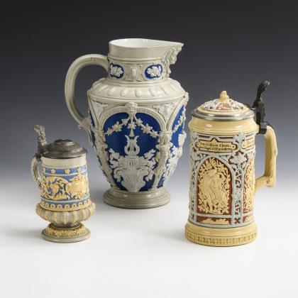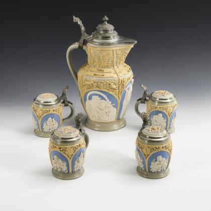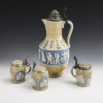 Large Mettlach relief jug and 3 jugs with handles. Villeroy & Boch.