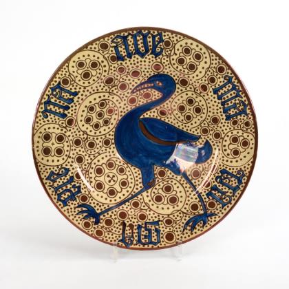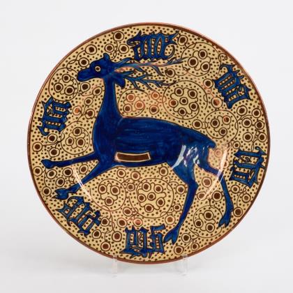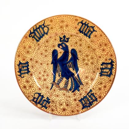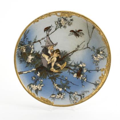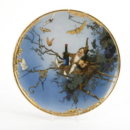 Signiert H. Schlitt. Geprägte Turmmarke 1885-1930, Modellnr. 2113. Großer Teller mit reliefiertem Goldrand und mehrfarbigem Chromolithdekor: Ein in blühenden Zweigen sitzender Zwerg mit 2 Mai?käfern, ein Römerglas an den Mund führend. ø ca. 41 cm. Der Münchner Maler Heinrich Schlitt lebte von 1848-1923. Er studierte an der Akademie für Bildende Künste in München und entwarf für Mettlach verschiedene Krug- und Wandtellermotive. Besondere Bekanntheit erlangte er für seine lustigen Zwergen- und Märchenmotive. Der Wandteller wird im Produktkatalog der Firma Mettlach vom 1899 aufgeführt. Vgl. Anton Post: Mettlacher Steinzeug 1885-1905. Saarwellingen 1976, S. 176. ABB.B 195