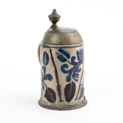 Westerwald roller jug with tulip decoration in blue and manganese purple.