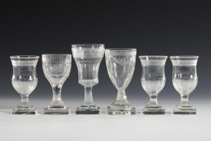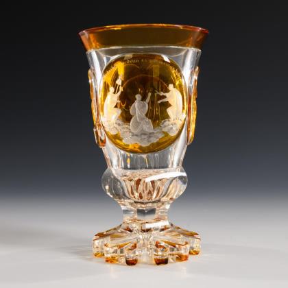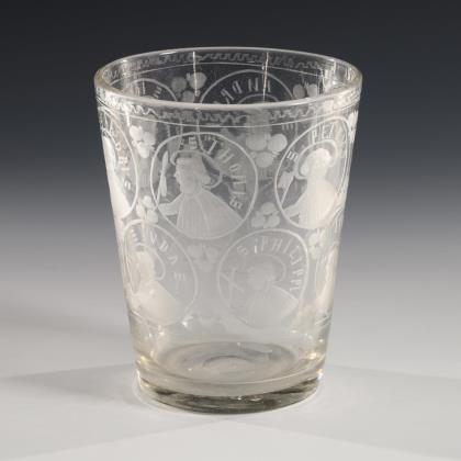 Großer Apostelbecher Riesengebirge, 2. Viertel 18. Jh. Graustichiges Glas mit Abriss. Auf der leicht geweiteten Wandung zwei Reihen mit versetzten Kartuschen, darin geschnittene Darstellungen der zwölf Apostel mit Attributen und Bezeichnungen. H. 12,5 cm Lit.: Histoire du verre du baroque aux lumieres, 2008, S. 119. bei Fischer 2022