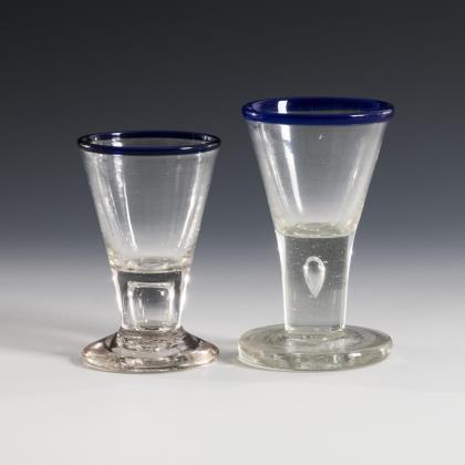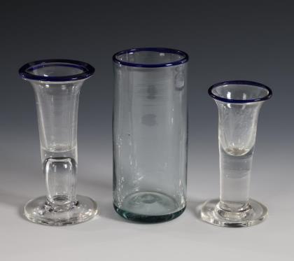 2 shot glasses and 1 cylinder glass with blue rim. Lauenstein.
