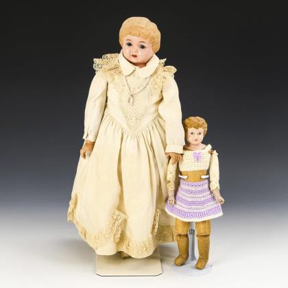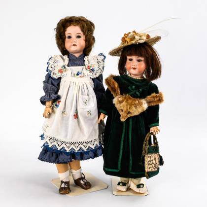Both with chest head, blue glass eyes, mohair wig and bisque forearms. 3200: with oilcloth body, light green dress and matching hat, l 56 cm. / Florodora: with leather body, dressed as a kitchen maid with flowered dress, white apron and bonnet. Restored right hand, l 57 cm