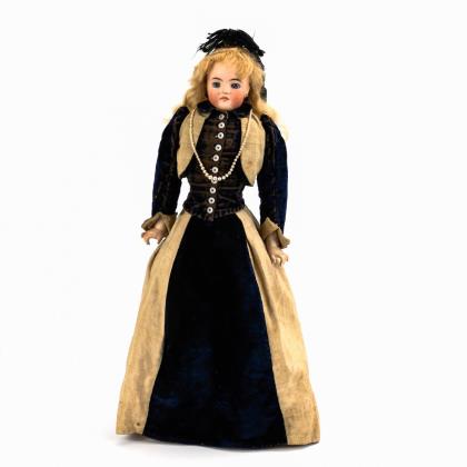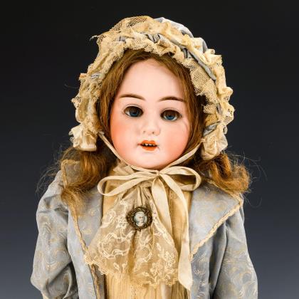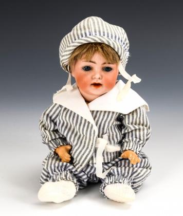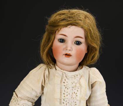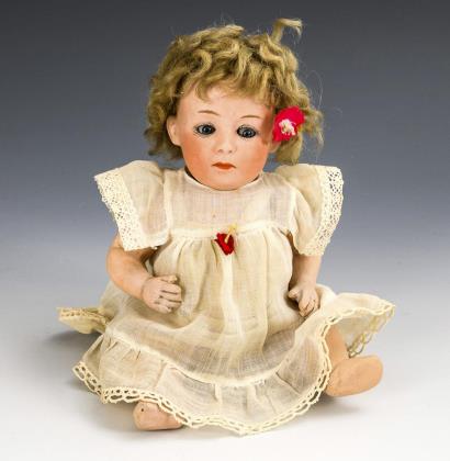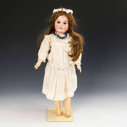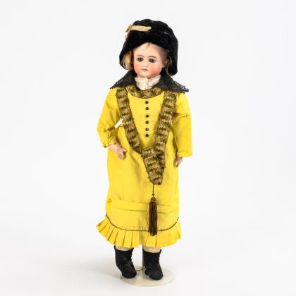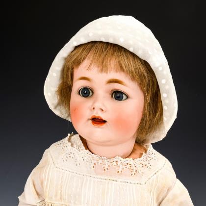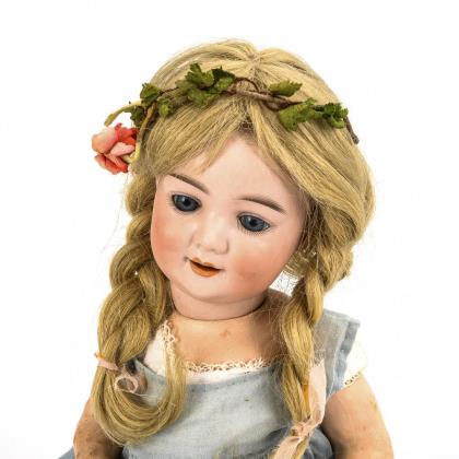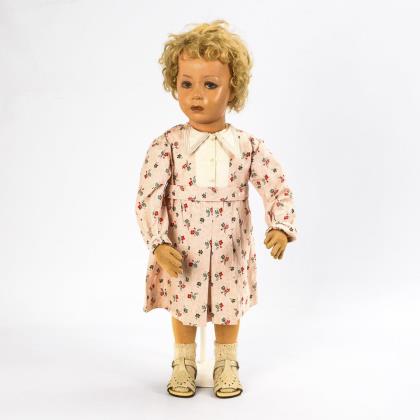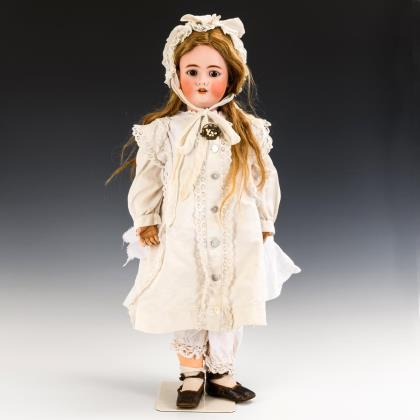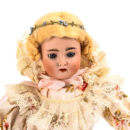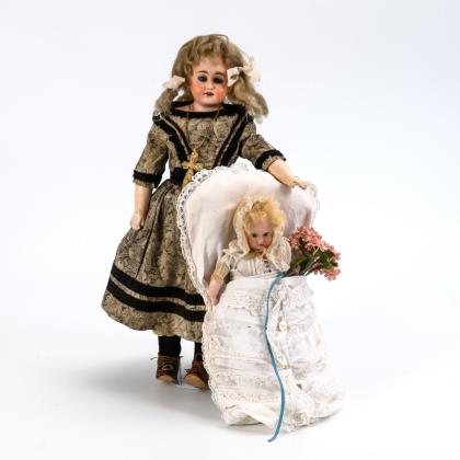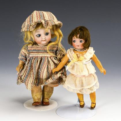Both with crank head, blue sleeping eyes and dark blond wig. The larger one for Kämmer and Reinhardt: 11-piece body with running mechanism. L 63 cm. The smaller one for Wiesenthal, Schindel & Kallenberg: 15-piece jointed body. L 55 cm. Both with light-colored dresses, hood and white leather shoes.