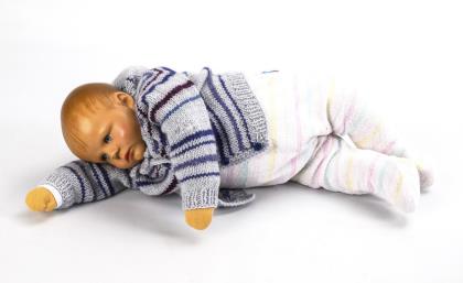 Text umkopiert, prüfen blauer ergänzter Baby-Strampler Unter dem rechten Fuß undeutlicher Stempelrest. 1980er Jahre. Stoff, Kunststoff. L 49 cm. 2600 g. Sogenanntes Sandbaby oder Lernbaby für Hebammen und Krankenschwestern. Beschwerte Ausführung mit geöffneten Augen, Nabel und Poloch.