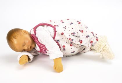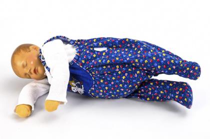 blauer Strampler (ergänzt) TräumerchenKäthe Kruse. Unter dem rechten Fuß undeutlicher Stempelrest. 1980er Jahre. Stoff, Kunststoff. L 49 cm. 2600 g. Sogenanntes Sandbaby oder Lernbaby für Hebammen und Krankenschwestern. Beschwerte Ausführung mit geöffneten Augen, Nabel und Poloch.