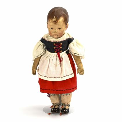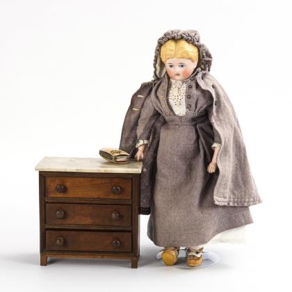 Doll with painted blue eyes and sculpted hair. Leather body with mass links. Gray costume with hooded cape, l 43 cm. Comes with a 3-tier chest of drawers with marble top, 18 x 18 x 10 cm