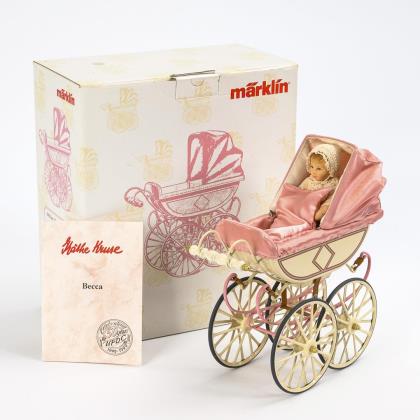 Little doll "Becca" in a baby carriage. Käthe Kruse & Märklin.