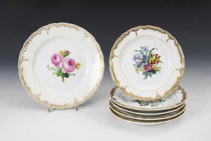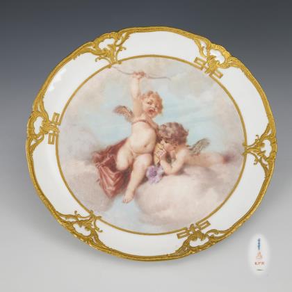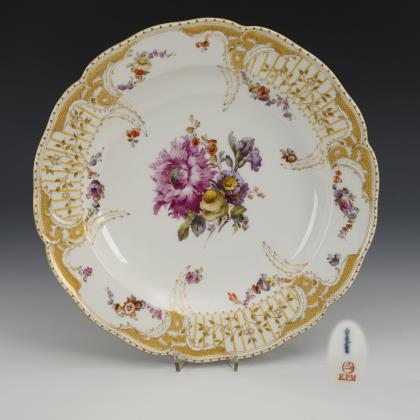 Form-Modell und Malerei nach Meissner Vorbild, die durchbrochen gearbeitete Fahne mit aufgelegten, blau staffierten Vergissmeinnicht-Blüten und vier Reliefkartuschen. Farbige Bemalung mit Blumenbuketts in den Kartuschen, im Spiegel schwarz konturierte breite Goldreserven mit Gitterwerk, feine farbige Genremalerei nach Altmeister-Gemäldevorlagen, Goldstaffage. Pressmarken, blaue Zeptermarken einmal gestrichen