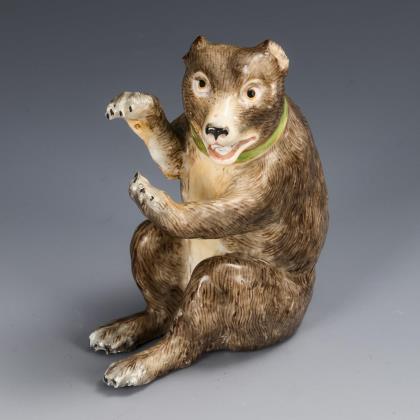 Seltener Bär, Meissen. Kleine, verblasste Blauschwertermarke auf unglasiertem Boden, um 1745. Entwurf von Johann Joachim Kaendler, 1741. Sitzender Braunbär mit grünem Halsband. Farb- und goldstaffiert. 4 Krallen minimal bestoßen, kleiner Brandriss an 1 Bein. H 10 cm. Rückert, Rainer, Meissener Porzellan 1710-1810, Katalog Ausstellung im Bayerischen Nationalmuseum München 1966, München 1966, Kat.-Nr. 1171; Pietsch, Ulrich (Hg.), Die Arbeitsberichte des Meissener Porzellanmodelleurs Johann Joachim Kaendler 1706-1775; Leipzig 2002, S. 87
