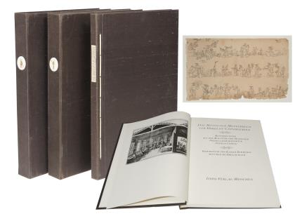 Schulz-Codex: über 1000 Motive auf 132 Tafeln. Faksimile in fünf-achtfarbigem Druck, Tafeln in zwei Kassetten, Textband mit japanischer Blockheftung. Kommentar von Rainer Behrends mit über 180 Abbildungen. Deutsch-englisch-französisch-spanischer Text. Verlag Edition Leipzig 1978. Nummeriert: 467. Einmalige limitierte Auflage von 1500 Exemplaren, nach dem Druck wurden die Druckträger vernichtet ! Die Musterblätter aus der Meissner Malstube werden erstmalig vollständig wiedergegeben. Einband mit Honanseide überzogen, im Rücken eigens für diese Ausgabe angefertigte Plaketten aus Meissner Porzellan