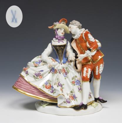 Modell-Jahr: 1740, Figuren der Commedia dell'Arte, ehemalige Bezeichnung "Beltrame und Columbine", farbig bemalt, gold staffiert. Pressmarken, Schwertermarke