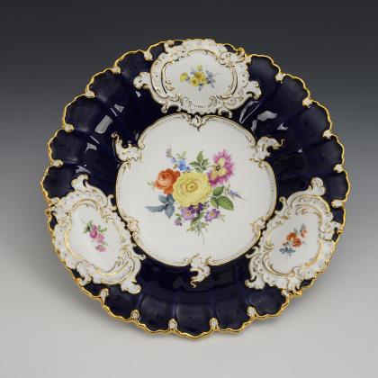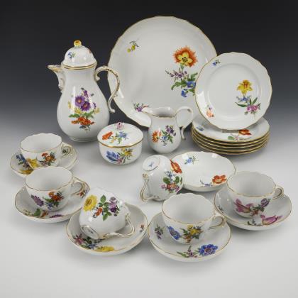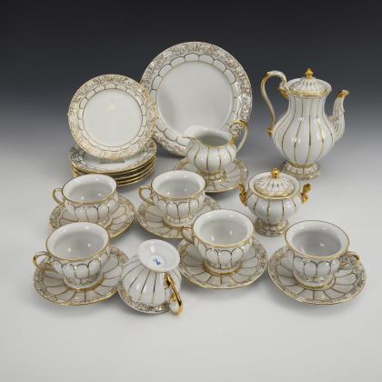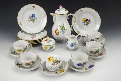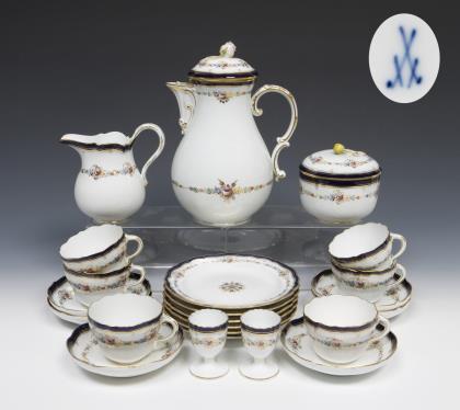 Form "Neuer Ausschnitt", farbig bemalt, gold staffiert, kobaltblaue Ränder. Florale Bemalung mit farbigen Blüten und Blattranken in Gold. Dessertteller mit filigranen Rosetten im Spiegel. 23 Teile: Kaffeekanne, Milchkanne, Zuckerdose, 6 Tassen, 6 Untertassen, 6 Dessertteller, 2 Eierbecher. Schwertermarken, Kaffeekanne 1924-1934, eine Schwertermarke mit Punkt