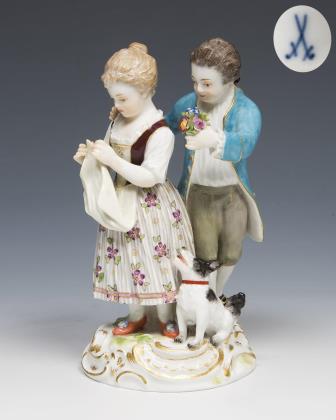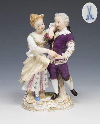 Modell-Jahr: 1895-1896, "Gärtnerkinder, tanzend", farbig bemalt, gold staffiert. Ritzmarke, Pressmarke, Malermarke, Schwertermarke