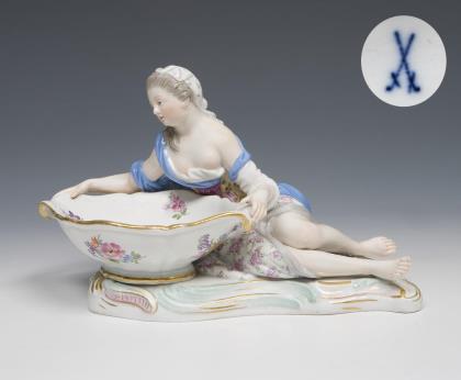 Modell-Jahr: 1762, "Dame an Schale", Pendant zu "Kavalier an Schale" (Modell-Nr. 2872). Farbig bemalt, gold staffiert. Ritzmarke, Pressmarke, Malermarke, Schwertermarke