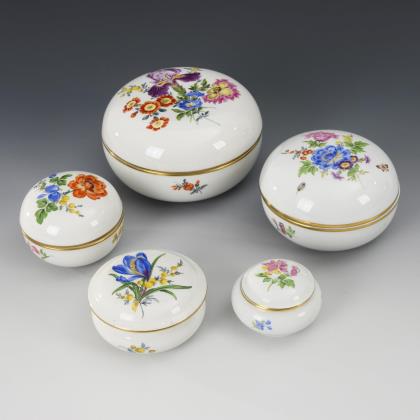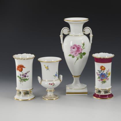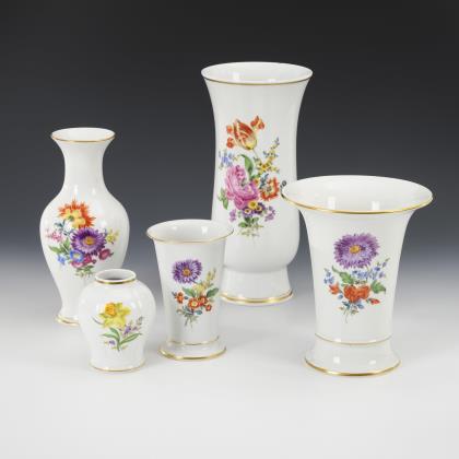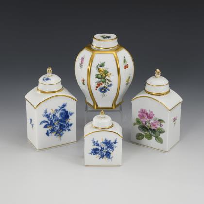 4 vases and 1 tea caddy with flower painting. Meissen.