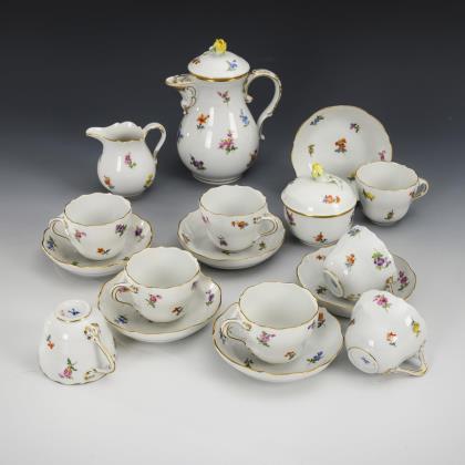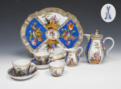 8 Teile: Tablett, Mokkanne, Milchkännchen, Zuckerschälchen, 2 Mokkatassen, 2 Untertassen. Farbige Hausmalerei, gold staffiert, Goldspitzenbordüren. Zwischen Blüten über königsblauem Fond verschiedene Watteauszenen. Ritzmarke, Pressmarken, Schwertermarken mit runden Ausschliffen, zwei Marken zweimal gestrichen